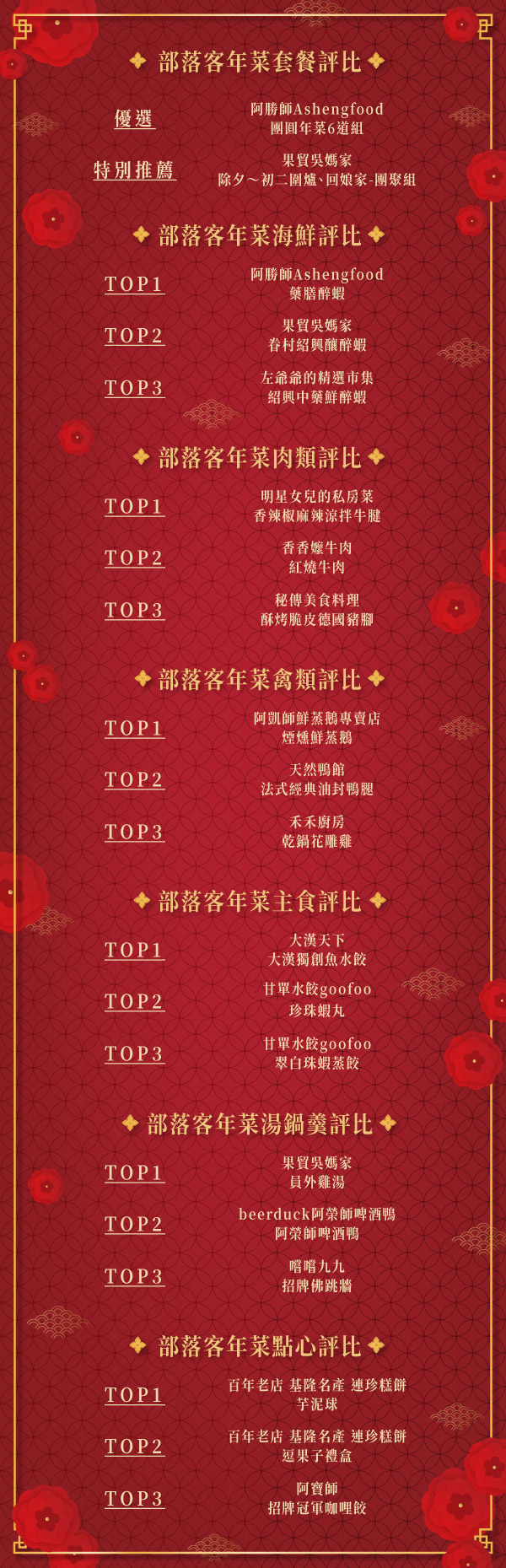 以下依序公布「套餐組合、湯鍋羹類、主食、肉類、禽類、海鮮、點心」共七大類別評比結果的 TOP 3 排行,並匯集百萬人氣部落客實際試吃評語。這麼多年菜料理中,究竟有哪些高 CP 值選擇?哪一道能夠滿足挑剔的味蕾?網購年菜之前,別忘了參考以下 2020 年菜排行榜,讓全家人過年團圓吃得滿意又開心!